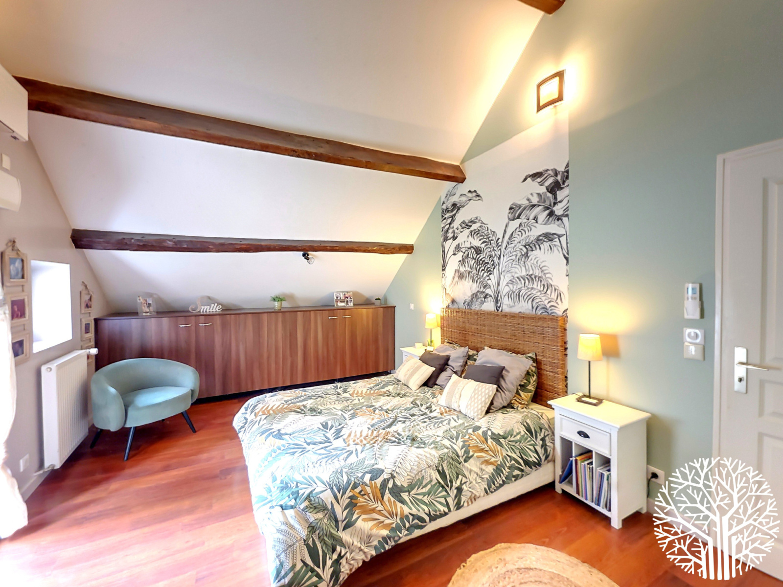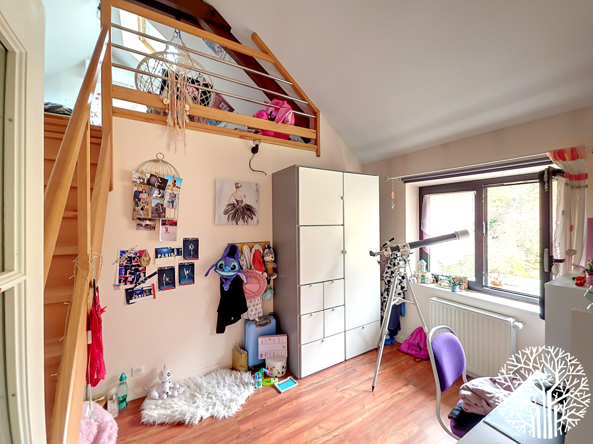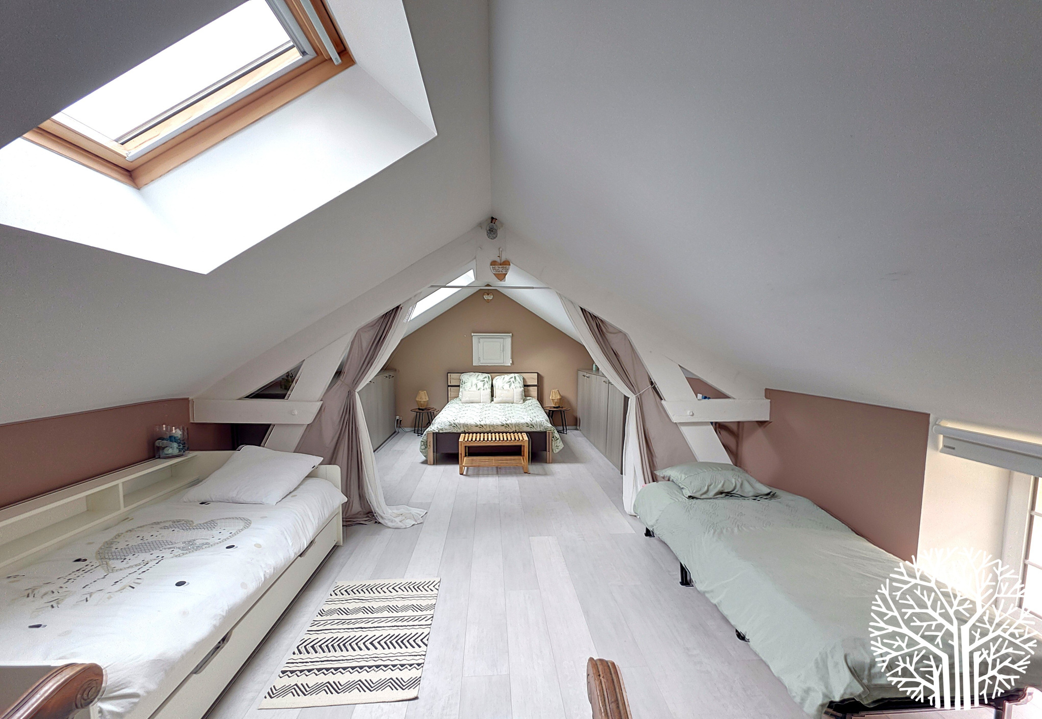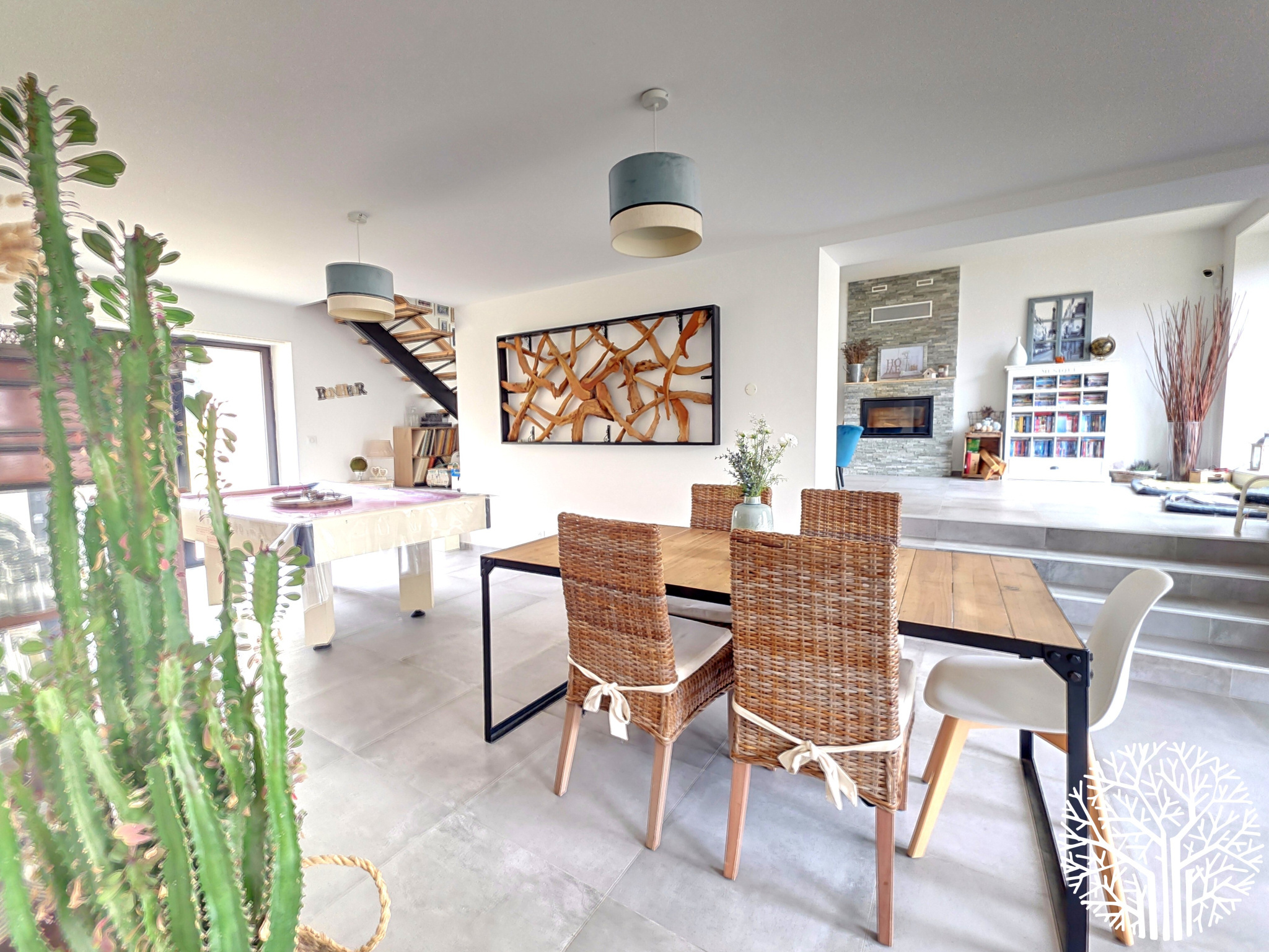 La maison principale séduit par ses volumes généreux et sa luminosité exceptionnelle. Elle comprend une cuisine équipée traversante, un cellier/buanderie avec chaudière gaz de ville, une salle à manger lumineuse, un salon avec cheminée insert traversante, et une chambre de plain-pied. À l’étage : suite parentale avec salle de bain privative, deux chambres supplémentaires avec salle de douche, et une chambre avec mezzanine et salle d’eau privative.