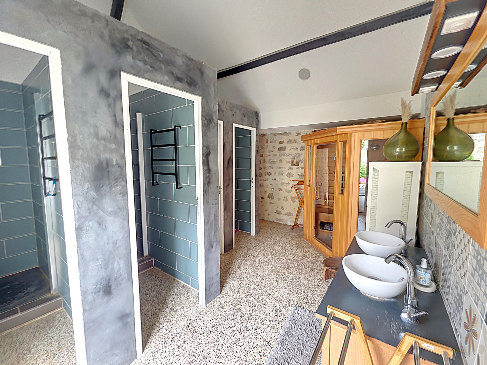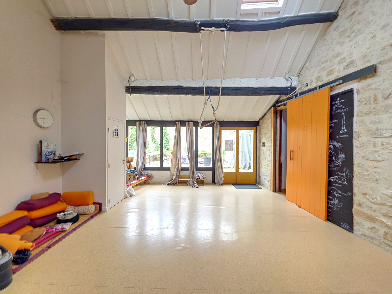 Un espace de réception dédié offre une GRANDE PIÈCE MODULABLE, idéale pour les séances de YOGA, RELAXATION OU MÉDITATION. Vous y trouverez également une SALLE D'EAU COLLECTIVE AVEC PLUSIEURS DOUCHES et un SAUNA, ainsi qu'un GRAND DORTOR.